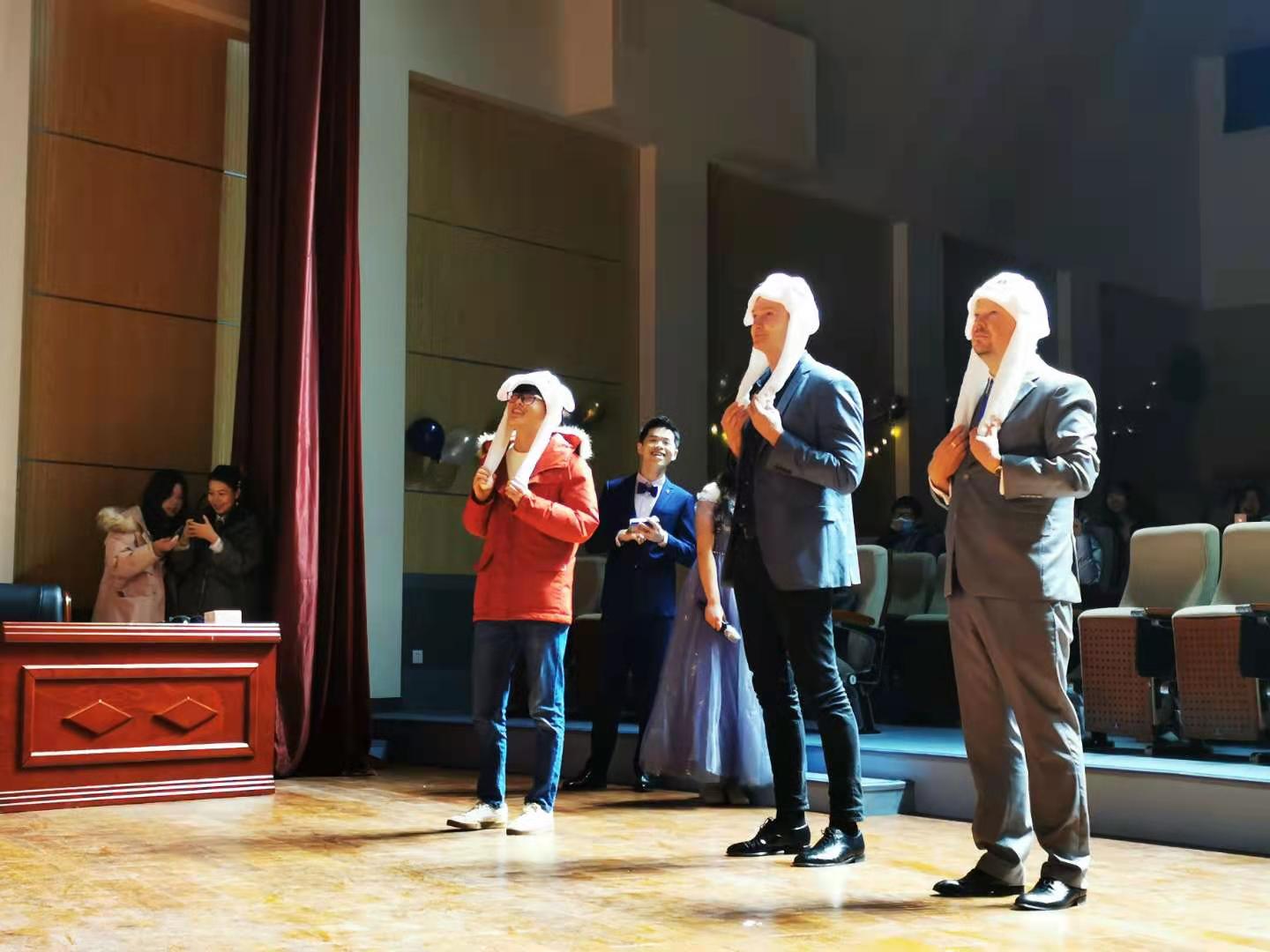 在晚会游戏环节,同学们踊跃参与,游戏氛围十分和谐欢乐,不论输赢都获得了一份礼物。获胜组的一位同学还有幸与Deupmann和Szurawitzki两位外教同台竞技,现场笑声不断。
